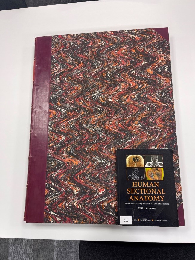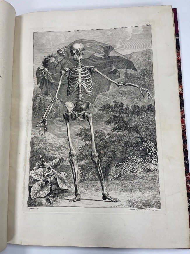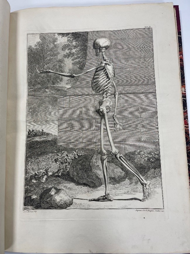 An unauthorised English translation of the book was published in London in 1749. Titled Tables of the skeleton and muscles of the human body, this is the edition held by the BMA library. As you can see from the picture, it is an impressive sized volume compared to other books in the library!