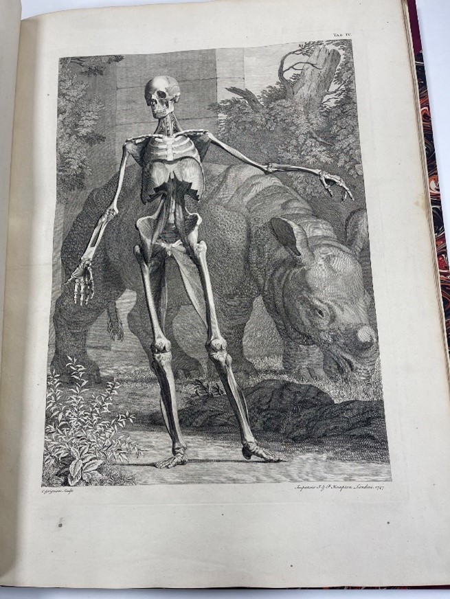 These show a standing human skeleton with partial musculature posed in front of a rhinoceros, one view from the front and one from the back. These anatomical illustrations are renowned not only as the first of their kind that influenced generations of anatomists and artists, but for incorporating the first accurately drawn depictions of a living rhinoceros. Wandelaar drew the exotic animal from life at the Amsterdam Zoo, where the first living specimen to arrive in Europe, nicknamed Clara, was brought in 1741.