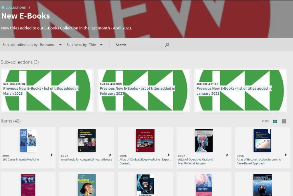 The New E-Books curated collection brings together all of the titles that we have added to our collection in the previous month. You can also find three sub-collections, one for each of the preceding months, allowing you to rapidly browse and access all of the e-books we have added in the last four months: