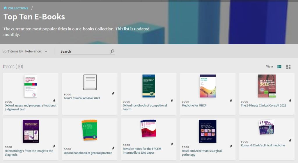 We also have a Top Ten E-Books curated collection which, as the name suggests, displays the current ten most accessed titles in our e-book collection.