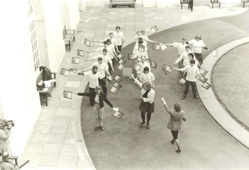 Photograph of Junior Doctors Committee members for the SOS for the NHS campaign, taken in the courtyard of BMA House, in 1989.